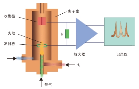 氫火焰離子化檢測器(FID),它是典型的破壞性、質量型檢測器、是以氫氣和空氣燃燒生成的火焰為能源,當有機化合物進入以氫氣和氧氣燃燒的火焰,在高溫下產生化學電離,電離產生比基流高幾個數量級的離子,在高壓電場的定向作用下,形成離子流,微弱的離子流經過高阻放大,成為與進入火焰的有機化合物量成正比的電信號,因此可以根據信號的大小對有機物進行定量分析。