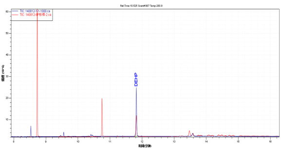 樣品TIC圖(藍色)與鄰苯混標TIC圖(紅色)