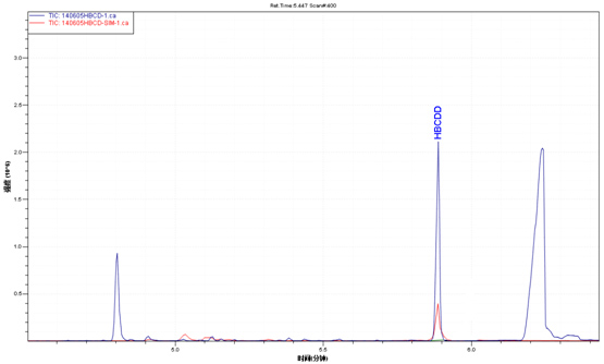 樣品TIC圖(藍色)與六溴環十二烷標準品TIC圖(紅色)