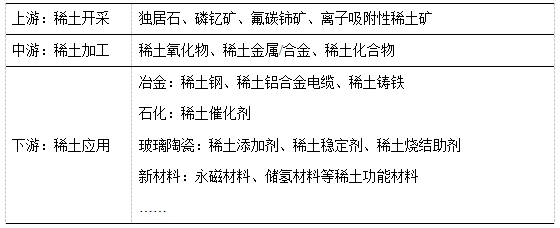 稀土產(chǎn)業(yè)鏈主要由稀土資源開采,稀土材料制備,以及稀土應(yīng)用領(lǐng)域構(gòu)成。其中:稀土資源開采主要涉及的稀土礦物有氟碳鈰礦、獨(dú)居石、磷釔礦,以及離子吸附性稀土礦;稀土材料制備包括精礦分解以及冶煉;稀土應(yīng)用領(lǐng)域包括冶金、軍事、石化、玻璃陶瓷、農(nóng)業(yè)、新材料等領(lǐng)域,是我國關(guān)鍵的戰(zhàn)略性資源。
