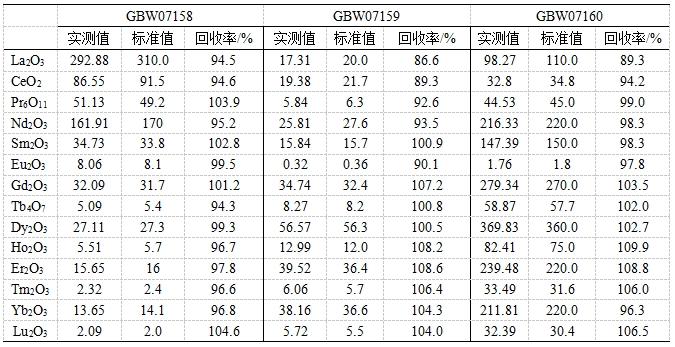 參考《GB/T 40798 離子型稀土原礦化學(xué)分析方法 稀土總量的測(cè)定 電感耦合等離子體質(zhì)譜法》,采用氫氟酸、硝酸、高氯酸進(jìn)行濕法消解。利用碰撞反應(yīng)模式控制氧化物產(chǎn)率,降低輕稀土氧化物/氫氧化物對(duì)其他稀土元素的干擾;并根據(jù)實(shí)際樣品中元素含量,校準(zhǔn)稀土氧化物/氫氧化物的干擾。對(duì)三個(gè)稀土礦標(biāo)準(zhǔn)物質(zhì)中14種稀土元素(以氧化物形式表示)進(jìn)行測(cè)試,各元素回收率為86.6 %~109.9%。
