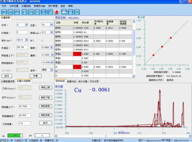 樣品測試:于原子吸收光譜儀波長324.8nm處,使用空氣-乙炔火焰,以水調零,測量試液的吸光度,減去隨同試料的空白試驗溶液的吸光度,從工作曲線上查出相應的銅濃度。