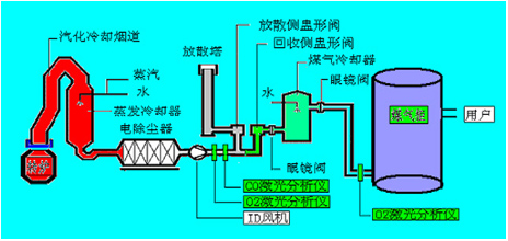 如圖2可見(jiàn),在回收側(cè)盅形閥/分散側(cè)盅形閥前布設(shè)煙氣在線分析儀,只有當(dāng)通過(guò)CO在線監(jiān)測(cè)系統(tǒng)測(cè)得轉(zhuǎn)爐煤氣中的CO濃度在30%以上時(shí),才打開(kāi)氣體切換站的回收側(cè)盅形閥進(jìn)入煤氣柜儲(chǔ)存,否則通過(guò)分散側(cè)盅形閥通過(guò)放散塔點(diǎn)火燃燒。在煤氣柜前布設(shè)煙氣在線分析儀,只有在線監(jiān)測(cè)系統(tǒng)測(cè)分析保證煤氣柜內(nèi)O2含量不會(huì)超標(biāo)(控制在1%以下)才允許焦煤煤氣進(jìn)入煤氣柜,否則啟動(dòng)停止回收,以保證系統(tǒng)的穩(wěn)定性和安全性。