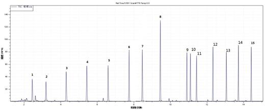 1.正己烷 2.苯 3.三氯乙烯 4.甲苯 5.辛烯 6.乙酸丁酯 7.乙苯 8.對(間)二甲苯 9.鄰二甲苯 10.苯乙烯 11.壬烷 12.異辛醇 13.十一烷 14.十四烷 15.十六烷