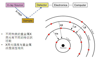 X射線熒光光譜技術(XRF)的原理見圖3所示,可以直接檢測固體或液體樣品中ppm量級的元素成分。采用富集后再檢測的辦法,使得XRF技術對空氣顆粒物中的重金屬成分的檢測限優(yōu)于0.001ug/m3。而常規(guī)實驗室的檢測技術,由于預處理消解過程中需要將微克量級的樣品溶解到幾十克的液體中,而使得濃度被稀釋百萬倍,從而多數儀器(譬如ICP-AES、或原子吸收光譜儀)無法檢出元素含量低于10ug/m3量級的空氣顆粒物樣品。