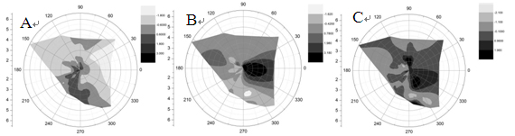 圖6 EHM-X200大氣重金屬監(jiān)測儀監(jiān)測數據PM2.5中元素主成分分析得到的各組分與風向關系圖。圖A是組分1(工業(yè)、生活燃料燃燒)的濃度與風向關系圖,從圖中可以看出組分1主要來源于監(jiān)測點位的西南方向(深色區(qū)域);圖B是組分2(冶金工業(yè)廢氣)的濃度與風向關系圖,從圖中可以看出組分2來源于監(jiān)測點自身范圍內(深色區(qū)域);圖C是組分3(揚塵)的濃度與風向關系圖,從圖中可以看出組分3主要來源于監(jiān)測點位的東方及北方(深色區(qū)域)。圖中顏色深淺由淺到深代表污染的程度由小到大。