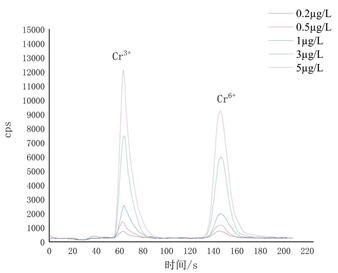 用1 mg/L Cr3+和Cr6+混合標準溶液依次稀釋配制濃度分別為0.2 μg/L、0.5 μg/L、1.0 μg/L、3 μg/L、5