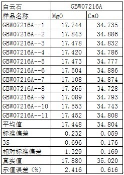 ④ .實際測試白云石國標樣GBW07216A的數(shù)據(jù)如下為