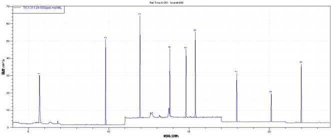 水樣經(jīng)固相萃取柱濃縮、凈化、洗脫后,氮吹定容到一定體積,過濾后樣品經(jīng)氣相色譜分離后,用質(zhì)譜進(jìn)行檢測(cè)。通過與待測(cè)目標(biāo)物標(biāo)準(zhǔn)質(zhì)譜圖相比較和保留時(shí)間進(jìn)行定性,外標(biāo)法定量。