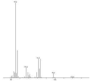 甜蜜素的主要衍生物環己醇亞硝酸酯作為定性和定量,如圖1。保留時間8.511min.定性離子(m/z)為55,81,83。定量離子為55。質譜圖見圖2.