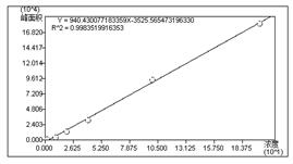 準確吸取濃度為10ug/mL的甜蜜素標準溶液10ul50ml離心管中對應衍生物濃度分別為2ug/mL10ug/mL20ug/mL100ug/mL200ug/mL,按照上述標樣衍生化步驟進行衍生化,進行線性測試。實驗所得線性方程為:y=940.43x-3525.57,線性相關系數為0.9984,如圖5所示。